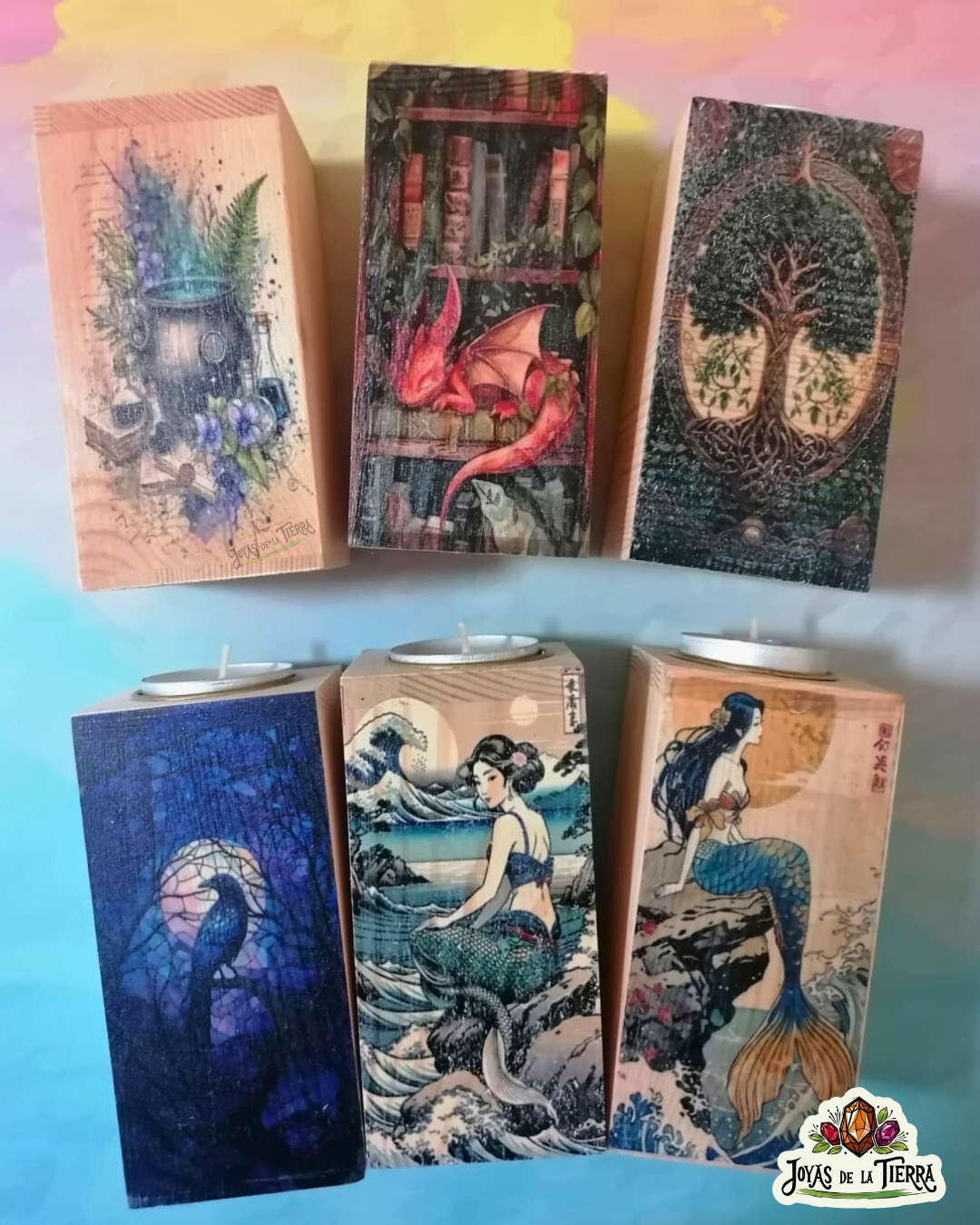 Hechos a mano y con ilustraciones cargadas de simbolismo, estos candelabros son más que decoración: son portales energéticos para elevar tu vibración, manifestar deseos y llenar de magia tu espacio.